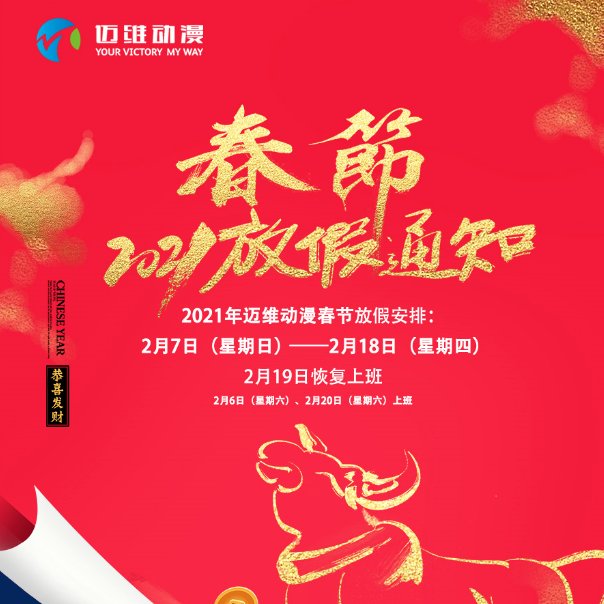一年一度的農歷春節(jié)已近在眼前,惜別2020年,我們迎來了充滿希望、機遇和挑戰(zhàn)的2021年!在此,感謝大家在過去一年里對邁維動漫的支持與信任。為了讓公司員工過一個歡樂祥和的春節(jié),公司2021年春節(jié)放假時間具體安排如下